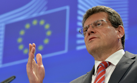 7月1日,在比利時布魯塞爾,歐盟委員會副主席馬羅什·謝夫喬維奇召開關于烏克蘭、俄羅斯和歐盟三方天然氣問題談判的新聞發(fā)布會。 烏克蘭石油天然氣公司當天發(fā)表聲明說,即日起暫停向俄羅斯天然氣工業(yè)股份公司購買天然氣。聲明強調(diào),俄羅斯向歐盟出口的天然氣將繼續(xù)過境烏克蘭進行輸送。