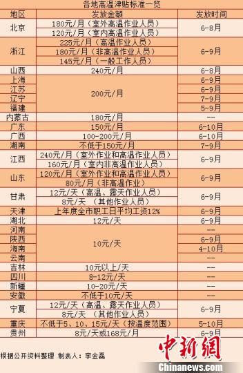 其中,北京高溫津貼發(fā)放時(shí)間為每年6月至8月,室外露天作業(yè)人員高溫津貼每人每月不低于180元,在33℃(含33℃)以上室內(nèi)工作場所作業(yè)的人員高溫津貼每人每月不低于120元;上海高溫津貼發(fā)放時(shí)間為每年6月至9月,標(biāo)準(zhǔn)為每月200元;廣東高溫津貼發(fā)放時(shí)間為6月份至10月份,標(biāo)準(zhǔn)為每人每月150元;湖南發(fā)放時(shí)間7月1日至9月30日,每人每月不低于150元。