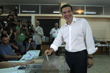 7月5日,在希臘雅典,希臘總理齊普拉斯在一家投票站投票。 希臘5日舉行全民公決,以決定是否接受債權(quán)人早先提出的協(xié)議草案,這將對如何解決希臘債務(wù)危機乃至希臘的歐元區(qū)地位產(chǎn)生重要影響。公決初步結(jié)果擬于當(dāng)晚宣布。
