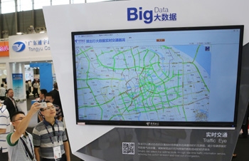 7月15日,上海觀眾在世界移動大會上參觀實時交通顯示系統(tǒng)。??記者 裴鑫/攝 |