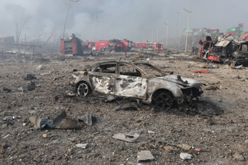 圖為爆炸現(xiàn)場(chǎng)汽車(chē)殘骸?!∮浾?金立旺/攝