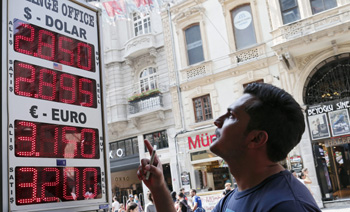 8月18日,在土耳其伊斯坦布爾,一名男子注視匯率顯示屏。土耳其里拉對美元匯率18日再創(chuàng)歷史新低,跌至1美元兌換2.906里拉。自今年初迄今,里拉對美元貶值約20%,為貶值最嚴(yán)重的新興市場貨幣之一。同日,土耳其中央銀行決定,維持今年5月以來的利率水平?!⌒氯A社/歐新中文 |