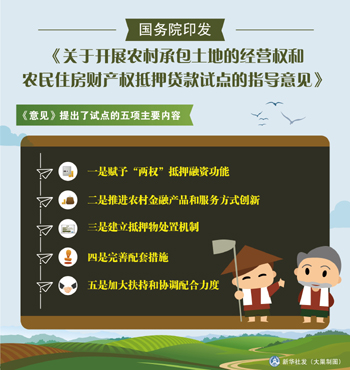 ??? 農(nóng)村金融制度和農(nóng)村土地產(chǎn)權(quán)制度的一項(xiàng)重要改革創(chuàng)新——農(nóng)民承包土地的經(jīng)營權(quán)和農(nóng)民住房的財(cái)產(chǎn)權(quán)等“兩權(quán)”作為抵押物向金融機(jī)構(gòu)貸款終于迎來了頂層設(shè)計(jì)。國務(wù)院日前正式發(fā)布了《國務(wù)院關(guān)于開展農(nóng)村承包土地的經(jīng)營權(quán)和農(nóng)民住房財(cái)產(chǎn)權(quán)抵押貸款試點(diǎn)的指導(dǎo)意見》(以下簡稱《意見》),要求試點(diǎn)地區(qū)穩(wěn)妥有序開展“兩權(quán)”抵押貸款業(yè)務(wù),有效盤活農(nóng)村資源、資金、資產(chǎn),增加農(nóng)業(yè)生產(chǎn)中長期和規(guī)?;?jīng)營的資金投入,為穩(wěn)步推進(jìn)農(nóng)村土地制度改革提供經(jīng)驗(yàn)。
