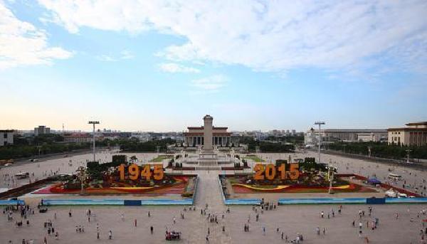 8月26日零時(shí),天安門廣場(chǎng)紀(jì)念抗戰(zhàn)勝利70周年花卉全部布置完畢。此次天安門廣場(chǎng)花卉布置主要包括四個(gè)方面:人民英雄紀(jì)念碑周邊的檜柏花帶、人民英雄紀(jì)念碑北側(cè)的長(zhǎng)城主題花壇、廣場(chǎng)內(nèi)東西兩塊綠地的花柱、花球、花帶以及廣場(chǎng)東西側(cè)路的花缽80組。其中長(zhǎng)城主題花壇總占地3000平方米,兩組花壇每組東西長(zhǎng)60米,南北寬25米,使用龍柏、葉子花、油松等大型植物3000株,小型花卉7萬(wàn)盆、景觀石及仿真景觀石1200平方米。