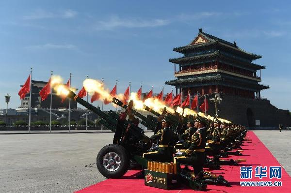 ??? 9月3日,中國人民抗日戰(zhàn)爭暨世界反法西斯戰(zhàn)爭勝利70周年紀(jì)念大會(huì)在北京隆重舉行。這是禮炮在天安門廣場鳴響。 新華社記者 任軍川 攝