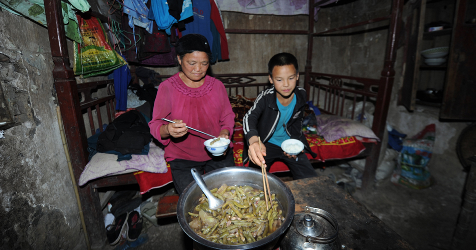 貴州省畢節(jié)市七星關(guān)區(qū)田坎鄉(xiāng)田坎村的瑞瑞是一名留守兒童,12歲的他和70歲的奶奶住在一間土坯房中。記者日前在他家里看到,房間里不但堆滿了廢品,還到處都是雞的糞便,充斥著一股濃烈的腐臭氣味。但即便這樣的房子也還是別人的。瑞瑞家的房子因年久失修成為危房,去年村里一位好心人擔(dān)心他們的安全將房子借給他們住。瑞瑞的爸爸三年前外出打工,但卻有一年多沒和家里聯(lián)系,媽媽兩年前改嫁到四川。記者看到,祖孫二人的午飯是由瑞瑞做的,主食為苞谷飯、菜是素瓜豆。他告訴記者,上學(xué)期間6點多就要起床,第一件事就是做飯,晚飯也是自己做。