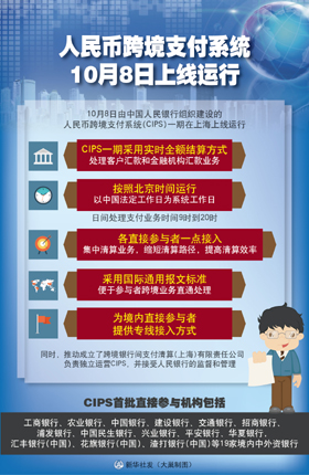 人民幣國際化進程再次迎來里程碑式事件。10月8日,人民幣跨境支付系統(tǒng)(一期)成功上線運行。人民幣跨境支付系統(tǒng)英文簡稱為CIPS,為境內(nèi)外金融機構人民幣跨境和離岸業(yè)務提供資金清算、結算服務,是重要的金融基礎設施,也是人民幣國際化的有力支撐點。