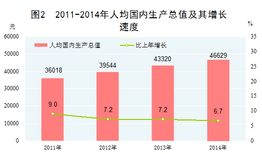 人均國(guó)內(nèi)生產(chǎn)總值穩(wěn)步提高。2014年,我國(guó)人均國(guó)內(nèi)生產(chǎn)總值46629元,扣除價(jià)格因素,比2010年增長(zhǎng)33.6%,年均實(shí)際增長(zhǎng)7.5%。根據(jù)世界銀行數(shù)據(jù),我國(guó)人均國(guó)民總收入由2010年的4300美元提高至2014年的7380美元,在上中等收入國(guó)家中的位次不斷提高。