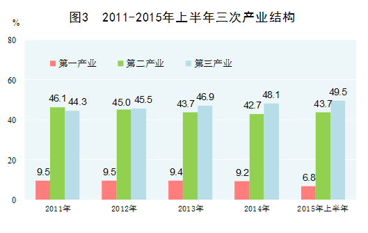 服務(wù)業(yè)成為第一大產(chǎn)業(yè)。隨著我國(guó)經(jīng)濟(jì)發(fā)展水平的提高,對(duì)生產(chǎn)性和生活性服務(wù)的需求不斷擴(kuò)大,服務(wù)業(yè)在國(guó)民經(jīng)濟(jì)中的地位上升。2012年,我國(guó)第三產(chǎn)業(yè)現(xiàn)價(jià)增加值占國(guó)內(nèi)生產(chǎn)總值的比重上升到45.5%,首次超過(guò)第二產(chǎn)業(yè)成為國(guó)民經(jīng)濟(jì)第一大產(chǎn)業(yè)。2014年,第三產(chǎn)業(yè)比重上升到48.1%,比2010年提高3.9個(gè)百分點(diǎn),2015年上半年進(jìn)一步上升到49.5%。