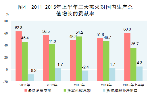 內(nèi)需特別是消費(fèi)對(duì)經(jīng)濟(jì)增長(zhǎng)貢獻(xiàn)明顯增強(qiáng)。在擴(kuò)大內(nèi)需戰(zhàn)略的帶動(dòng)下,消費(fèi)的基礎(chǔ)性作用和投資的關(guān)鍵性作用得到較好發(fā)揮,特別是消費(fèi)結(jié)構(gòu)升級(jí)帶動(dòng)居民消費(fèi)潛力有序釋放,消費(fèi)成為拉動(dòng)經(jīng)濟(jì)增長(zhǎng)的主動(dòng)力。2011-2014年,最終消費(fèi)對(duì)經(jīng)濟(jì)增長(zhǎng)的年均貢獻(xiàn)率為54.8%,高于投資貢獻(xiàn)率7.8個(gè)百分點(diǎn)。2015年上半年,消費(fèi)對(duì)經(jīng)濟(jì)增長(zhǎng)的貢獻(xiàn)率上升為60%。