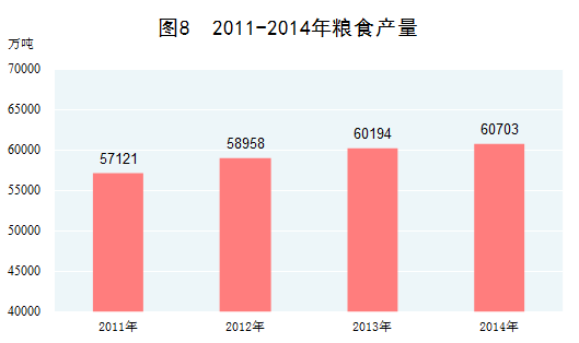 農(nóng)業(yè)基礎(chǔ)進(jìn)一步鞏固。2014年,糧食總產(chǎn)量取得歷史性突破,達(dá)到60703萬(wàn)噸,比2010年增長(zhǎng)11.1%,年均增長(zhǎng)2.7%,實(shí)現(xiàn)“十一連增”。近年來(lái),我國(guó)谷物、肉類、籽棉、花生、茶葉、水果等農(nóng)產(chǎn)品產(chǎn)量穩(wěn)居世界第一位。