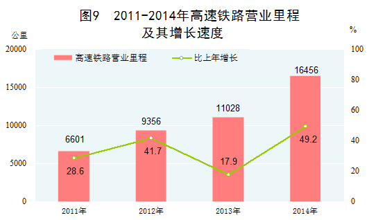 交通運(yùn)輸能力持續(xù)增強(qiáng)。高效、便捷的鐵路網(wǎng)、公路網(wǎng)、航空運(yùn)輸網(wǎng)、城際鐵路網(wǎng)、航道網(wǎng)逐漸形成。2014年末,鐵路營(yíng)業(yè)里程、公路里程、高速公路里程、定期航班航線里程分別達(dá)到11.2萬(wàn)公里、446.4萬(wàn)公里、11.2萬(wàn)公里、463.7萬(wàn)公里,分別比2010年末增長(zhǎng)22.6%、11.4%、51.0%、67.7%。特別是,高速鐵路迎來(lái)了史無(wú)前例的大發(fā)展,2014年高速鐵路運(yùn)營(yíng)里程突破1.6萬(wàn)公里,位居世界第一,我國(guó)高鐵還駛出國(guó)門(mén),參與多國(guó)鐵路建設(shè),成為獨(dú)具特色、彰顯國(guó)力的中國(guó)名片。