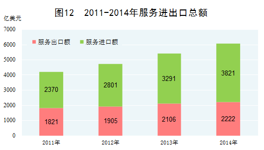 服務(wù)貿(mào)易取得長(zhǎng)足發(fā)展。2014年,服務(wù)進(jìn)出口總額達(dá)到6043億美元,比2010年增長(zhǎng)66.7%,年均增長(zhǎng)13.6%。服務(wù)貿(mào)易結(jié)構(gòu)逐步優(yōu)化,計(jì)算機(jī)、保險(xiǎn)、金融、咨詢等高附加值服務(wù)貿(mào)易出口增長(zhǎng)勢(shì)頭強(qiáng)勁。