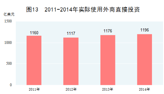 利用外資規(guī)模躍居世界第一。利用外資從追求量的擴(kuò)大轉(zhuǎn)向質(zhì)的提高。2011-2014年,我國(guó)累計(jì)實(shí)際使用外商直接投資4649億美元,年均增長(zhǎng)3.1%,其中,2014年實(shí)際使用外商直接投資1196億美元,首次躍居全球第一。外商投資領(lǐng)域也從一般制造業(yè)向高技術(shù)產(chǎn)業(yè)和金融、保險(xiǎn)等服務(wù)業(yè)拓展。