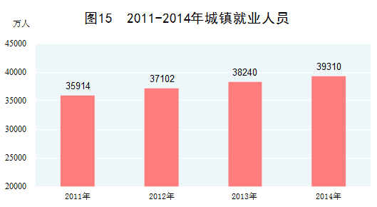 就業(yè)穩(wěn)步增加。高度重視就業(yè)工作,以改革促進(jìn)大眾創(chuàng)業(yè)、萬(wàn)眾創(chuàng)新,在經(jīng)濟(jì)增速放緩的背景下就業(yè)總量不降反升。2014年末,全國(guó)就業(yè)人員達(dá)到77253萬(wàn)人,比2010年末增加1148萬(wàn)人。其中,城鎮(zhèn)就業(yè)人員增加到39310萬(wàn)人,占全部就業(yè)人員的比重為50.9%,比2010年末提高5.3個(gè)百分點(diǎn)。2014年農(nóng)民工總量為27395萬(wàn)人,比2010年增長(zhǎng)13.1%,年均增長(zhǎng)3.1%。2015年上半年新增就業(yè)718萬(wàn)人,完成全年目標(biāo)的71.8%。