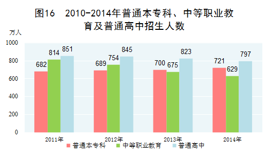 教育事業(yè)成績(jī)顯著。2014年,小學(xué)學(xué)齡兒童凈入學(xué)率達(dá)到99.8%;中等職業(yè)教育招生629萬(wàn)人,在校生1803萬(wàn)人,畢業(yè)生633萬(wàn)人;全國(guó)普通本專科招生721萬(wàn)人,在校生2548萬(wàn)人,畢業(yè)生659萬(wàn)人,分別比2010年增加60萬(wàn)人、316萬(wàn)人、84萬(wàn)人;高等教育毛入學(xué)率達(dá)到37.5%,比2010年提高11個(gè)百分點(diǎn)。
