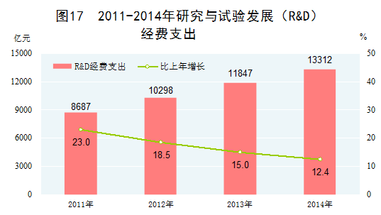 科技事業(yè)成果豐碩。2014年,研究與試驗(yàn)發(fā)展(R&D)經(jīng)費(fèi)支出13312億元,比2010年增長(zhǎng)88.5%,占國(guó)內(nèi)生產(chǎn)總值的比重為2.09%,比2010年提高0.36個(gè)百分點(diǎn)。專利申請(qǐng)量和授權(quán)量大幅增加。2014年,受理境內(nèi)外專利申請(qǐng)236萬(wàn)件,授予專利權(quán)130萬(wàn)件,分別比2010年增長(zhǎng)93.2%和59.9%。基礎(chǔ)研究和前沿技術(shù)研究取得一批重大成果,探月工程、載人深潛、衛(wèi)星應(yīng)用、超級(jí)計(jì)算等重大科研項(xiàng)目取得新突破,為產(chǎn)業(yè)轉(zhuǎn)型升級(jí)提供了強(qiáng)有力的技術(shù)支撐。