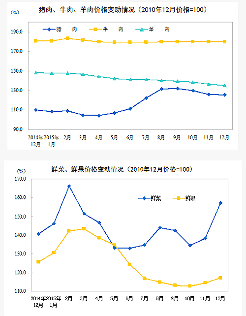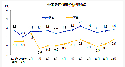2015年12月份,全國(guó)居民消費(fèi)價(jià)格總水平同比上漲1.6%。其中,城市上漲1.7%,農(nóng)村上漲1.5%;食品價(jià)格上漲2.7%,非食品價(jià)格上漲1.1%;消費(fèi)品價(jià)格上漲1.5%,服務(wù)價(jià)格上漲2.1%。2015年,全國(guó)居民消費(fèi)價(jià)格總水平比上年上漲1.4%。