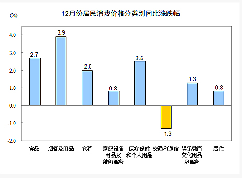12月份,非食品價(jià)格同比上漲1.1%。其中,煙酒及用品、醫(yī)療保健和個(gè)人用品、衣著、娛樂(lè)教育文化用品及服務(wù)、家庭設(shè)備用品及維修服務(wù)、居住價(jià)格分別上漲3.9%、2.5%、2.0%、1.3%、0.8%和0.8%;交通和通信價(jià)格下降1.3%。