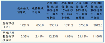 圖表2:壓力測試結果,20%跌幅下有近三成質(zhì)押市值觸及預警線? |