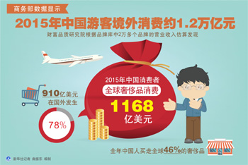 火爆的出境游帶動了海外消費。國家旅游局?jǐn)?shù)據(jù)顯示,2015年,中國出境旅游達1.2億人次,出境人次和消費均列世界第一。商務(wù)部數(shù)據(jù)顯示,2015年中國游客在境外消費約1.2萬億元,繼續(xù)保持世界主要旅游消費群體稱號。