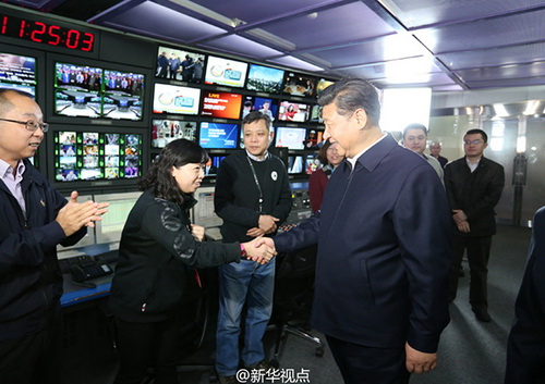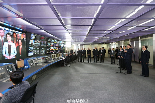 【總書(shū)記連線央視北美分臺(tái)】19日上午,習(xí)近平在中央電視臺(tái)調(diào)研,來(lái)到總控中心同位于華盛頓市中心的北美分臺(tái)視頻連線,了解分臺(tái)建設(shè)運(yùn)行情況。當(dāng)?shù)弥峙_(tái)成立4年,每天提供5小時(shí)、全自制的節(jié)目,90%的工作人員來(lái)自當(dāng)?shù)兀?xí)近平對(duì)此表示肯定,向分臺(tái)全體人員致以親切問(wèn)候和良好祝愿。