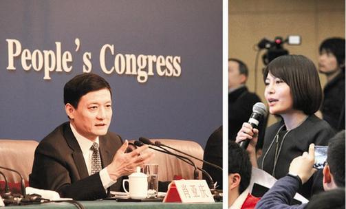 3月12日,十二屆全國人大四次會議新聞中心舉行記者會。國資委主任肖亞慶(左圖)在回答《經(jīng)濟參考報》記者楊燁(右圖)提問時表示,去年央企整體利潤為6.9%的負增長。在經(jīng)濟下行壓力下,今年以來,央企將壓力轉(zhuǎn)化為動力,1至2月份,央企利潤增長了4.7%。他說,央企今年的情況相對穩(wěn)定,各個央企在穩(wěn)增長和提效益方面也做了大量工作。不過,從部分行業(yè)目前所處的狀況來看,恐慌心理比下行壓力更可怕,并有可能帶來更大的下行。我國市場很大,關(guān)鍵是從央企開始,振奮精神,真抓實干,要把產(chǎn)品質(zhì)量提高,把成本降下來。????本報記者 張莫 攝