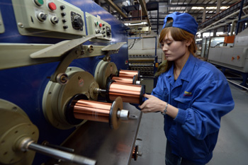 3月23日,在白銀有色長通電線電纜有限責任公司生產(chǎn)車間,工人從漆包機上取下超微細電磁線軸。 新華社記者 范培珅/攝 |