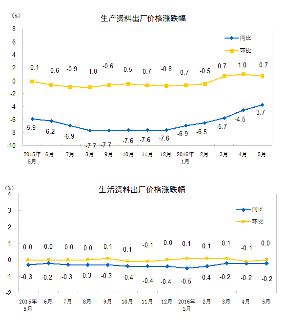2016年5月份,全國工業(yè)生產(chǎn)者出廠價格環(huán)比上漲0.5%,同比下降2.8%。工業(yè)生產(chǎn)者購進價格環(huán)比上漲0.6%,同比下降3.8%。1-5月平均,工業(yè)生產(chǎn)者出廠價格同比下降4.1%,工業(yè)生產(chǎn)者購進價格同比下降5.1%。