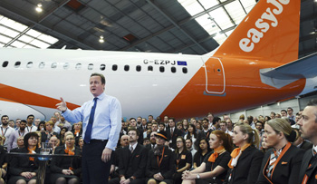 5月24日,英國首相卡梅倫在倫敦北部盧頓的易捷航空公司總部發(fā)表講話。 卡梅倫當(dāng)日說,如果在下月舉行的公投中選擇脫離歐盟,英國家庭去歐洲其他國家的旅行花費(fèi)平均水平將會(huì)上升。這是卡梅倫近期一系列警告脫歐將沖擊英國家庭經(jīng)濟(jì)狀況的最新表態(tài)。 新華社/路透? |