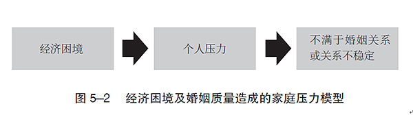 在現(xiàn)存的理論之中,艾奧瓦州立大學(xué)社會(huì)與行為研究所的蘭特?康格及其同事為我們提供的理論,用簡(jiǎn)單易懂的方式極為有效地解釋了經(jīng)濟(jì)條件與婚姻狀況之間的聯(lián)系。他們提出的有關(guān)經(jīng)濟(jì)困境造成家庭壓力的模型包括三個(gè)基本組成部分:(1)經(jīng)濟(jì)困境使得基本需求(比如食物和住宿)難以得到滿足;(2)婚姻雙方都背負(fù)了個(gè)人的壓力;(3)當(dāng)雙方溝通時(shí),會(huì)在感情中出現(xiàn)更多的負(fù)面行為,雙方對(duì)婚姻關(guān)系整體質(zhì)量的看法也會(huì)更加消極。
