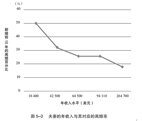 從有關(guān)財(cái)富和戀愛穩(wěn)定性的研究中我們可以清楚地看出,經(jīng)濟(jì)困境對(duì)于一段感情的正常運(yùn)轉(zhuǎn)起著至關(guān)重要的作用。2010 年的《離婚與再婚》雜志上發(fā)表了一項(xiàng)對(duì)30 000 多名女性展開的縱向追蹤研究,結(jié)果表明,在新婚的前10 年間,與位于最高年收入前5% (264 700 美元)的家庭相比,年收入位于最后5% 的家庭(18 400 美元)的離婚率要高出2.8 倍。貧困線(23 500 美元)位于收入最低的五分位數(shù)與下一個(gè)五分位數(shù)的交界點(diǎn),一旦越過這個(gè)點(diǎn),離婚率便出現(xiàn)了17% 的驟減,這也是離婚率下跌的最大幅度。當(dāng)收入超過中等收入水平(64 500 美元)后,離婚率也隨之出現(xiàn)了輕微的下降,但幅度卻比收入越過貧困線后出現(xiàn)的大幅驟降要小許多。