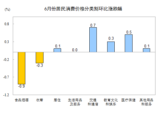 6月份,全國居民消費價格總水平環(huán)比下降0.1%。其中,城市下降0.1%,農(nóng)村下降0.1%;食品價格下降1.4%,非食品價格上漲0.2%;消費品價格下降0.4%,服務(wù)價格上漲0.3%。