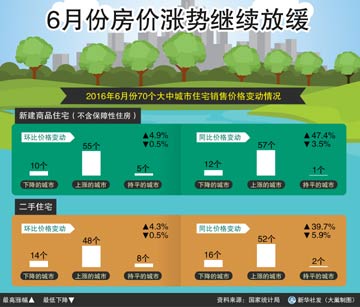 2016年上半年,房地產(chǎn)市場在短短6個月內(nèi)跌宕起伏。18日,國家統(tǒng)計局發(fā)布6月70個大中城市住宅銷售價格變動情況顯示,6月70個大中城市環(huán)比上漲城市數(shù)量55個,較上月減少5個,與4月價格上漲個數(shù)相比,減少10個,連續(xù)兩個月下降。漲幅方面,環(huán)比、同比最高漲幅有所收窄,具體來看,環(huán)比最高漲幅較5月的5.5%收窄0.6個百分點,同比漲幅較5月的54%收窄6.6個百分點。