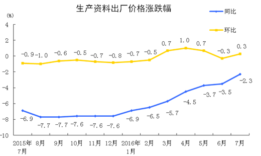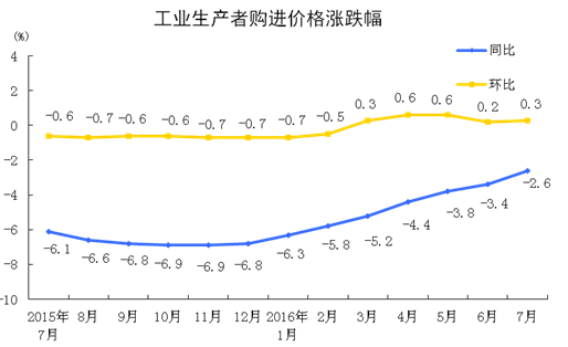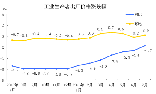 2016年7月份,全國工業(yè)生產(chǎn)者出廠價格環(huán)比上漲0.2%,同比下降1.7%。工業(yè)生產(chǎn)者購進(jìn)價格環(huán)比上漲0.3%,同比下降2.6%。1-7月平均,工業(yè)生產(chǎn)者出廠價格同比下降3.6%,工業(yè)生產(chǎn)者購進(jìn)價格同比下降4.5%。