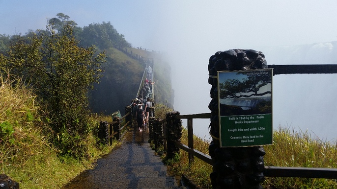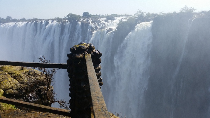 隆隆水聲越來(lái)越近,看到了!眼前一個(gè)寬不見(jiàn)邊的千丈峽谷,原本潺潺流淌的贊比西河至此飛流直下,頃刻間跌入100多米深的峽谷中,卷起千堆雪,萬(wàn)重霧。只見(jiàn)千萬(wàn)條雪浪翻滾,湍流怒涌,仿佛上帝之手將那千萬(wàn)匹銀練在我們面前同時(shí)舞動(dòng),令人目不暇接,嘆為觀止。