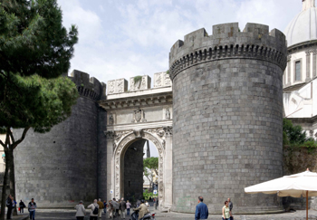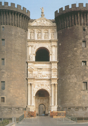 阿方索大王的兒子費(fèi)爾南特(Fernante, 1458年-1494年在位)和孫子阿方索二世(Alfonso II, 1494年-1495年在位)繼承其衣缽,繼續(xù)推行文化資助政策。在15世紀(jì)中后期費(fèi)爾迪南多一世在位期間,那不勒斯的人口增長迅速,老城日益擁擠,于是費(fèi)爾迪南多下令修建新城墻。新城墻的城門大多采用了文藝復(fù)興風(fēng)格,其中最著名的是卡普亞納城門(Porta Capuana)。這座城門很像阿方索大王凱旋門的縮小版,同樣是兩個(gè)圓柱碉堡拱衛(wèi)著一個(gè)古典化風(fēng)格的凱旋門(圖3)。
