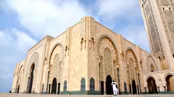 而在卡薩布蘭卡,有一座清真寺舉世聞名,那就是全世界現(xiàn)代化程度最高以及世界第三大的清真寺哈桑二世清真寺。遠(yuǎn)遠(yuǎn)看去,它似乎像一座漂浮在海上的清真寺,因?yàn)槠渲杏腥种坏拿娣e建在海上,以此來(lái)紀(jì)念摩洛哥的阿拉伯人祖先來(lái)自海上。而這個(gè)位置,也算得上伊斯蘭世界的最西端。