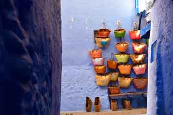 行走于舍夫沙萬(wàn),驚訝于這世間竟會(huì)有這樣的地方,將一種色彩演繹得如此淋漓盡致。屋頂、墻壁、樓梯、窗臺(tái)、甚至花盆,我目光能及的每個(gè)角落都被當(dāng)?shù)厝怂⒊闪怂{(lán)色。
