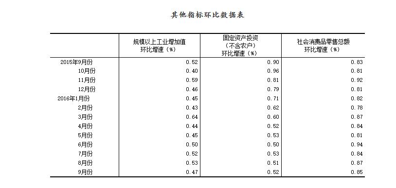 ?。?)根據(jù)季節(jié)調(diào)整模型自動修正結(jié)果,對近一年來各期國內(nèi)生產(chǎn)總值、規(guī)模以上工業(yè)增加值、固定資產(chǎn)投資(不含農(nóng)戶)、社會消費品零售總額環(huán)比增速進行修訂。修訂結(jié)果及2016年三季度GDP環(huán)比數(shù)據(jù)、2016年9月份其他指標環(huán)比數(shù)據(jù)如下: