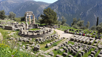 在距雅典150公里的帕那索斯深山里,有一處世界聞名的著名古跡,被稱為“地球的肚臍”的德?tīng)柗?。這里主要由阿波羅太陽(yáng)神廟、雅典女神廟、劇場(chǎng)、體育訓(xùn)練場(chǎng)和運(yùn)動(dòng)場(chǎng)組成,其中最有名的是古代希臘象征光明和青春并且主管音樂(lè)、詩(shī)歌及醫(yī)藥、畜牧的太陽(yáng)神阿波羅的神廟。古希臘人認(rèn)為,德?tīng)柗剖堑厍虻闹行模恰暗厍虻亩悄殹?。宙斯為了確定地球的中心在哪里,從地球的兩極放出兩只神鷹相對(duì)而飛。兩只鷹在德?tīng)柗葡鄷?huì),宙斯斷定這里是地球的中心,于是將一塊圓形石頭放在德?tīng)柗?,作為?biāo)志。如今這塊石頭就珍藏在德?tīng)柗撇┪镳^里。