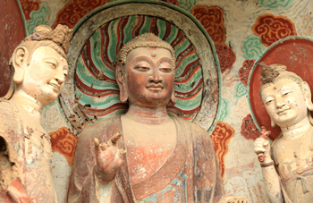 由于麥積山石質(zhì)皆為紫褐色的水成子母巖,不宜精雕細(xì)鏤,所以大多采用泥塑和繪畫,尤以泥塑藝術(shù)見長,被譽(yù)為“東方雕塑藝術(shù)館”。麥積山塑像,主要題材有佛、菩薩、弟子、天王、力士等,盡管歷代塑像同處一堂,但并不因襲模仿,而是保持著各自的時(shí)代特色,系統(tǒng)地反映了我國泥塑藝術(shù)的發(fā)展和演變過程。
