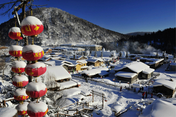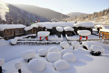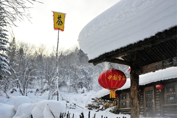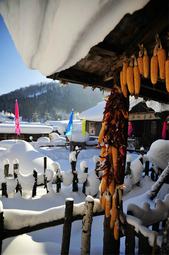 雪鄉(xiāng)的雪美得奇特,美得讓人不敢相信,真像童話故事和畫片中所描述的那樣,厚厚的白雪覆蓋的小村子連綿起伏,涌起像蘑菇一樣的座座小房子,在房頂和拌子垛上卷起一層層雪檐,她們就像剛長出來的一株株矮矮胖胖的“雪蘑菇”,慵懶而立。老房子外面的小院都是用木柵欄圍起來的,線條簡潔而不規(guī)范,如同炭筆畫漫不經(jīng)心的勾勒。當(dāng)柵欄的木枝披上銀色外衣之后,則酷似一根根即將融化的奶油冰棍,與中間的“蛋糕”相映成趣。房頂、大地、山上隆起的雪堆和線條柔潤如棉絮,潔白像陶塑銀雕,在陽光映照下變幻萬千,韻味無窮。家家戶戶貼滿五顏六色的掛線春聯(lián),掛起串串紅燈,把那素雅的銀裝世界裝點映襯得更加美麗生動。