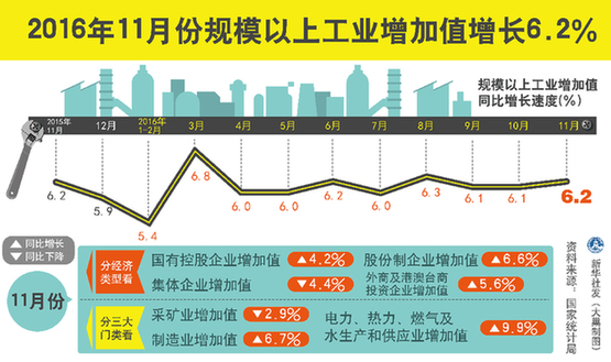 國家統(tǒng)計局13日公布數(shù)據(jù)顯示,11月國民經(jīng)濟運行保持在合理區(qū)間。11月,全國規(guī)模以上工業(yè)增加值按可比價格計算同比增長6.2%,增速比上月加快0.1個百分點,與上年同期持平;1-11月份,全國固定資產(chǎn)投資(不含農(nóng)戶)538548億元,同比增長8.3%,增速與1-10月持平;11月,社會消費品零售總額30959億元,同比名義增長10.8%(扣除價格因素實際增長9.2%),增速比上月加快0.8個百分點。