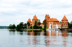 每到一個(gè)地方,我必先買些當(dāng)?shù)氐拿餍牌R粊砑慕o牽掛的人很浪漫,二來明信片上的風(fēng)光一般都是必去之處。特拉凱便是這樣。這個(gè)位于維爾紐斯城外20多公里處的一個(gè)精巧小鎮(zhèn),以加爾瓦湖心島上的特拉凱城堡聞名。建造于1409年的特拉凱城堡,以粉紅色磚砌成,佇立于湖中,遠(yuǎn)觀真恍如進(jìn)入童話,又不禁讓人想起那句“宛在水中央”來。