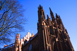 圣安娜教堂是維爾紐斯眾多教堂中有代表性的一個(gè),也是立陶宛最著名的哥特式建筑。這座小巧的教堂高只有22米,寬也只有10米,但砌教堂外墻卻用了33種不同形狀的紅磚。教堂結(jié)構(gòu)也頗為復(fù)雜,頂端既有主塔,又有若干個(gè)小捧護(hù),如眾星捧月。遠(yuǎn)望去,圣安娜教堂就像是一個(gè)由線條和角塔構(gòu)成的美麗童話。相傳,拿破侖東征沙俄時(shí)路過此地,被圣安娜教堂的精美所吸引,曾想將它“放在手掌中帶回巴黎”。