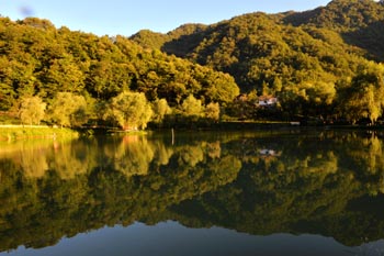 官鵝溝水秀。這里十余個大小不等、形態(tài)各異的湖泊,猶如一串綠色的珍珠鑲嵌在溝內,湖水清澈透底,隨湖底地貌高低呈不同顏色,那些倒映在湖中的古樹像一條條巨龍臥在湖底。藍天白云和青山古樹,映入湖中,使天地渾然一體,沒有界限。