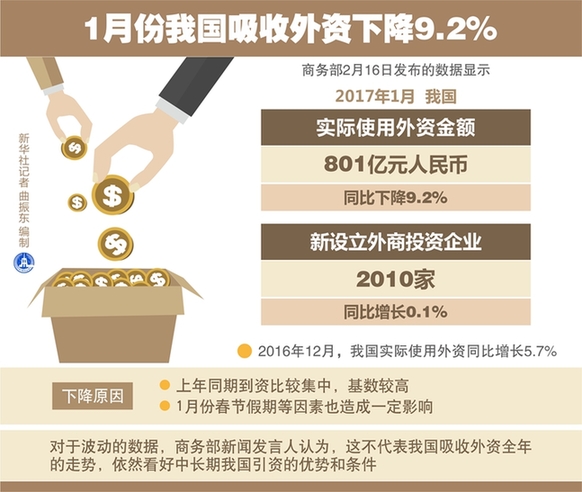 1月,我國實(shí)際使用外資金額801億元人民幣(折120億美元),同比下降9.2%。有人提出,這是否印證了“中國出現(xiàn)外資撤離潮”的說法?對此,商務(wù)部部長高虎城21日在國新辦發(fā)布會上給予了有力的反駁。
