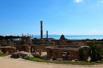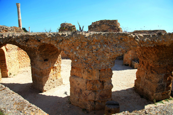 迦太基古城羅馬時代的遺跡殘存較多。羅馬人在比爾薩山上建有大神廟,露天柱廊上則保存有羅馬在迦太基最杰出的勝利神和豐收神的雕像。著名的公共浴場則是在公元145年-162年間羅馬皇帝安東尼時期建成的,是古羅馬的第四大浴場。從基部殘存的柱石、斷墻、拱門可隱約看出兩邊對稱排列的一間間浴室,浴室有更衣室、冷水室、溫水室、蒸汽浴室、按摩室、健身房等。浴場用水則從遠(yuǎn)處的山泉通過60公里長的引水渡槽引來。渡槽高6米-20米,至今仍遺存數(shù)段渡槽和支架。