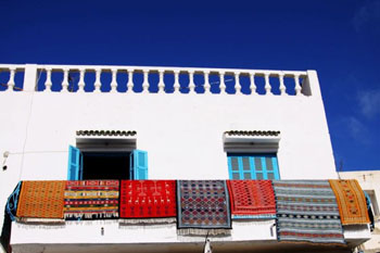 突尼斯海灣的邊上靜靜的藍(lán)白小鎮(zhèn),在透明的陽光中呼吸出了浪漫的色調(diào),這里被譽為“小圣托里尼”。之所以稱它為“藍(lán)白小鎮(zhèn)”,是因為這個坐落在地中海邊峭壁上的鎮(zhèn)子,所有的房屋只有兩種顏色,白色的墻,藍(lán)色的門窗。如此單純,卻是如此美麗。整個小鎮(zhèn)是沿山勢蜿蜒而上的,布局很簡單,一條鵝卵石鋪就的街道,兩邊是在陽光下閃閃發(fā)亮的白色房屋,也有些小巷從屋子內(nèi)伸出去。房屋都只有二三層高,最讓人感覺仿佛置身于童話的,是那白色墻上鑲嵌著的藍(lán)色的鐵窗和藍(lán)色的木門。阿拉伯式的蔓藤渦卷展現(xiàn)在鐵窗窗欞,對稱而迷幻;木門上半部的穹頂代表著清真寺的建筑,門上的藍(lán)色銅釘則拼合出星星和月亮,還有弓箭、花卉等伊斯蘭圖案,華麗而精美。